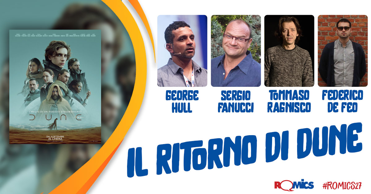 “Tra le sabbie di Arrakis a caccia della spezia, in un incontro sul discusissimo film di Denis Villeneuve tratto dalla saga di Frank Herbert, con il concept designer del film George Hull (collegato da remoto). A parlarne insieme a lui, l’editore italiano Sergio Fanucci (collegato da remoto), l’art director Tommaso Ragnisco e Federico De Feo, contributor Rolling Stone.“