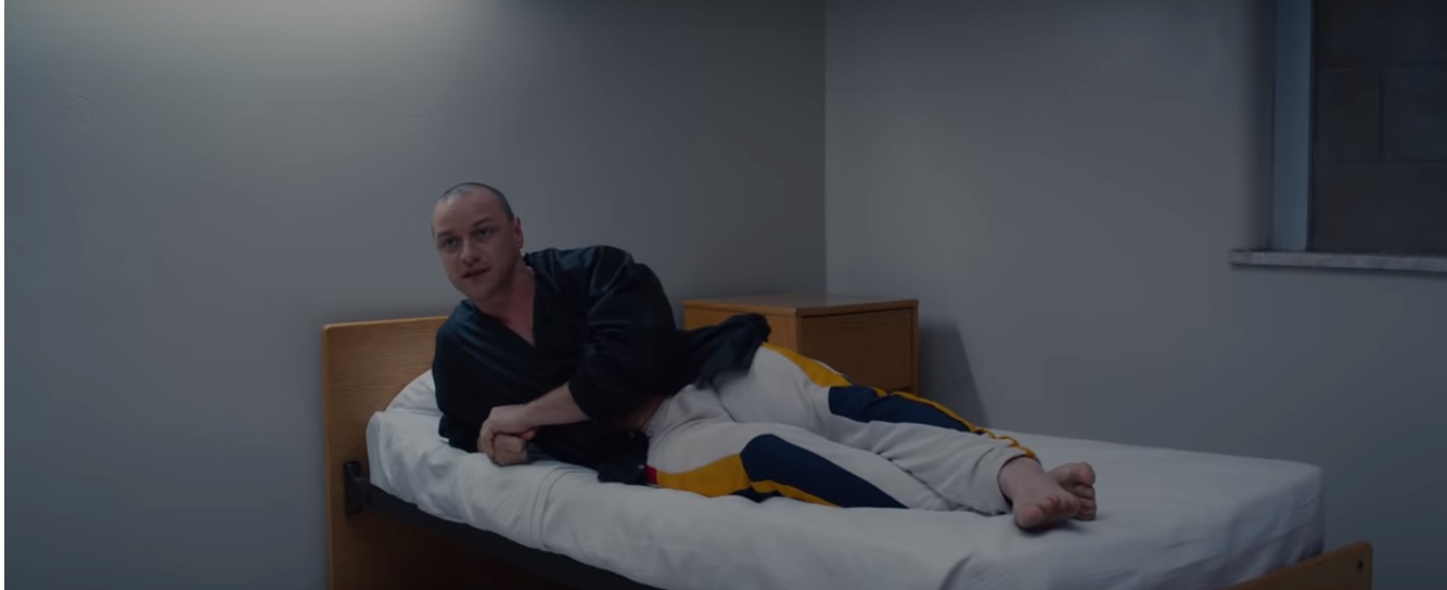 Subito dopo i loghi, ci viene presentato, tramite alcune inquadrature grandangolari, l’edificio all’interno del quale dovrebbero essere rinchiusi i tre protagonisti, probabilmente un istituto psichiatrico. Difatti si possono notare delle stanze differenziate tra di loro, a seconda delle esigenze del singolo individuo. La stanza di Kevin Wendell Crumb (James McAvoy), ad esempio, presenta un gran numero di spazzolini, come si era già visto nel suo rifugio in Split.
