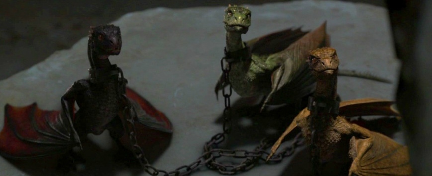 Quando tutti gli abitanti di Westeros pensavano che i Draghi fossero finalmente estinti, Daenerys riceve tre uova apparentemente pietrificate, con la speranza (mica tanta in realtà) che possano dar vita a qualche creatura. Con sua grande sorpresa, e con un pizzico di fuoco, le uova si schiudono portando alla nascita di tre piccolo draghetti, chiamati Drogon, Rhaegal e Viserion.