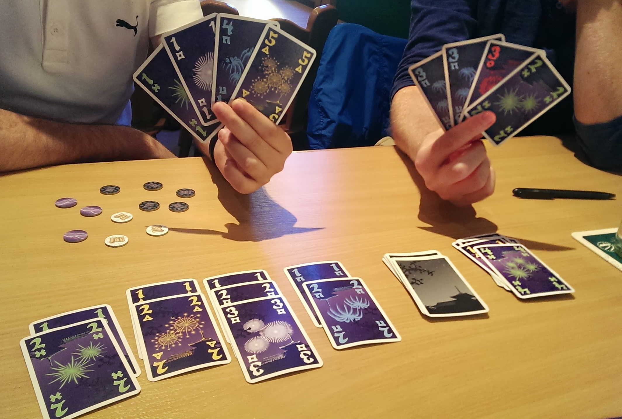 Si tratta infatti di un gioco collaborativo, in cui dovrete cercare di fare delle scale da 1 a 5, mettendo sul tavolo delle carte nei loro quattro colori (più un colore bonus con una “espansione” se così vogliamo chiamarla). La particolarità sta nel fatto che le vanno tenute in mano con la faccia, quindi con i numeri, rivolti verso i propri avversari.