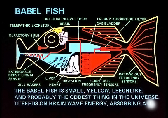 Giallo, di dimensioni contenute e in grado di vivere nel vostro orecchio. Riesce a tradurre ogni dialetto, lingua o idioma terrestre e non, semplicemente interfacciandosi con il vostro cervello. Pratico se dovete viaggiare sulla Terra, indispensabile se volete capire cosa stia blaterando da ore quello stupido Grigio di fronte a voi.