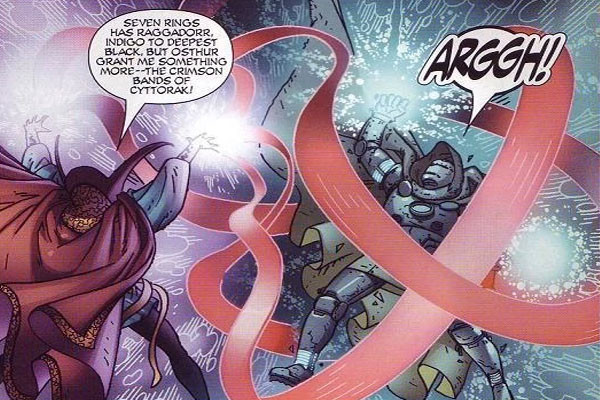Eeeh? Cos’ho detto? Se non siete lettori del Doc Strange vi risulterà un nome strano. Eppure è il nome dell’attacco che lo Stregone Supremo utilizza su Thanos su Titano. Avete presente quelle centinaia di bende rosse che imprigionano il Titano Pazzo? Ecco si tratta di quelle. Nel fumetto Strange ricorre a questo incantesimo più volte. Peccato per Star Lord che poi getta tutto alle ortiche.