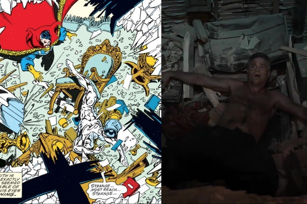 Nell’arco narrativo Infinity Gauntlet (dal quale il film prende molto della trama) un particolare messaggero arriva rovinosamente sulla Terra per annunciare l’arrivo del Titano. Chi? Silver Surfer! Esso precipita sfondando diversi piani della Sancta Sanctorum di Strange proprio, come nel film, fa Hulk. La tavola del fumetto è inequivocabilmente riportata sul grande schermo, solo con un messaggero di sventura diverso.