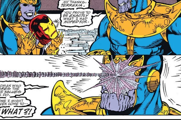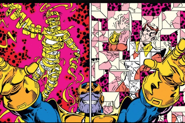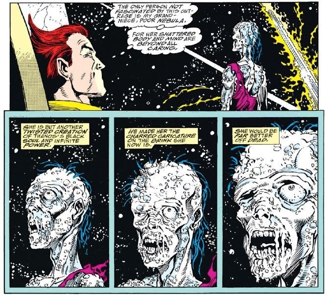 Parlando sempre della saga Infinity Gauntlet, ritroviamo una sua pagina trasposta sullo schermo ma con i personaggi nuovamente modificati. Avete presente quando su Knowhere i due Guardiani Drax e Mantis vengono deformati dalla Gemma della Realtà? Ecco, nel fumetto succede esattamente la stessa cosa a Nebula e Eros. Cambiano i personaggi, ma i destini rimangono uguali.
