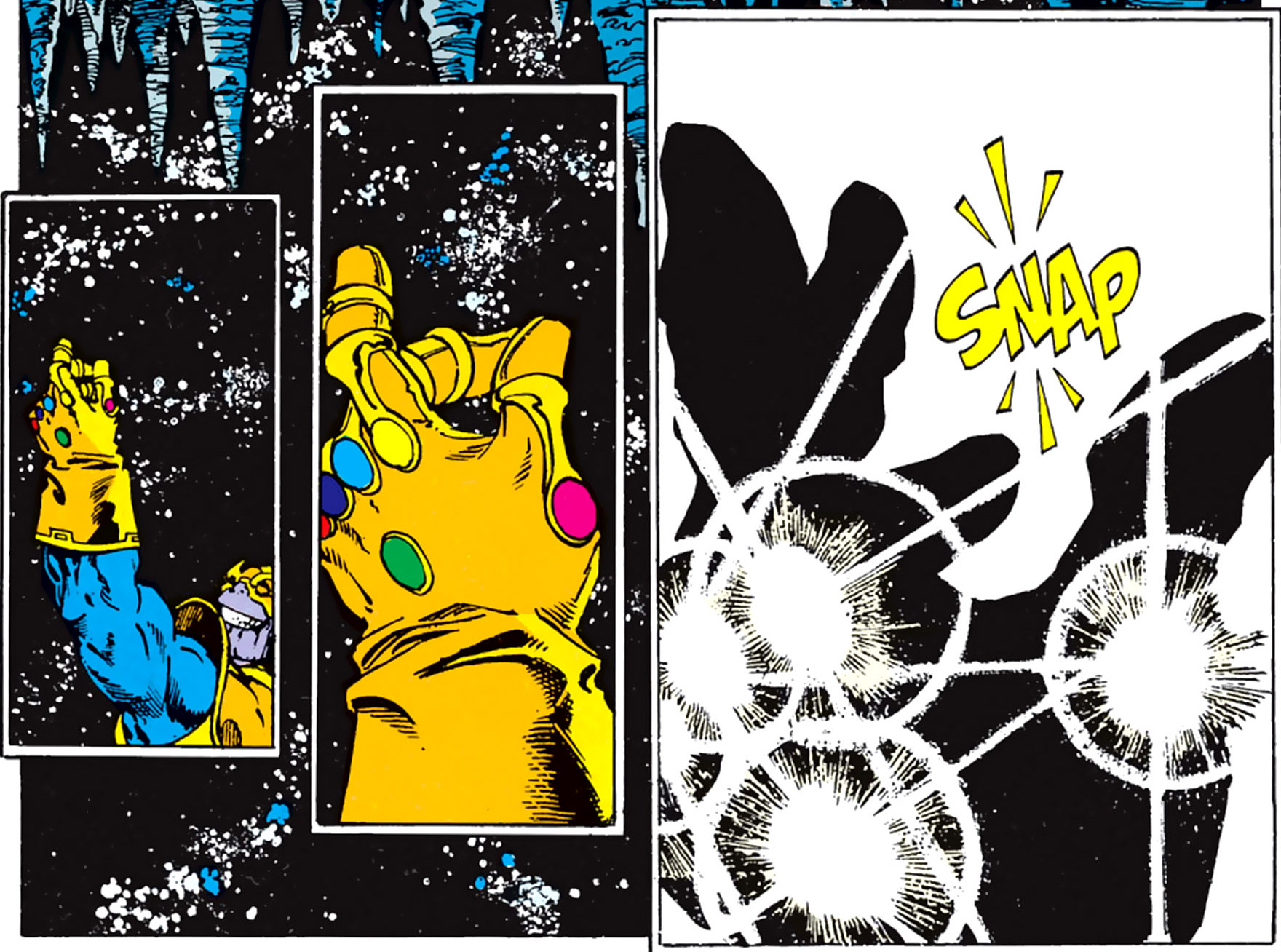 Per finire, abbiamo due vere e proprie perle. Due momenti topici del finale del film ripresi direttamente dalla fine fumettistica della saga Infinity Gauntled. Non dobbiamo dire molto. Basta dire che sono concettualmente identiche al fumetto. Stesso peso narrativo, stesso carico di emozioni. Thanos che schiocca le dita uccidendo di fatto un incalcolabile numero di vite e poi sempre lui. Che siede tranquillo, vivendo in un’umilissima capanna. Osservando felice l’orizzonte.