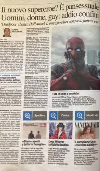 Non ci sarebbe nulla di sbagliato in un film su di un eroe apertamente omosessuale, né su di uno dichiaratamente pansessuale come, di fatto, Deadpool stesso è. Ma il modo artificioso con cui si costruisce la notizia, in un paese di falsi benpensanti, ammiccando più o meno volutamente a certe correnti culturali (o meglio, politiche), fa francamente sorridere. Fa sorridere che non si sia fatto un minimo di ricerca sul personaggio, non tanto per conoscerlo, ma per avere almeno un’idea vagamente chiara del PERCHE’ si sia scelto un certo tipo di marketing, a fronte di altri supereroi ben più “machi” e incazzati.