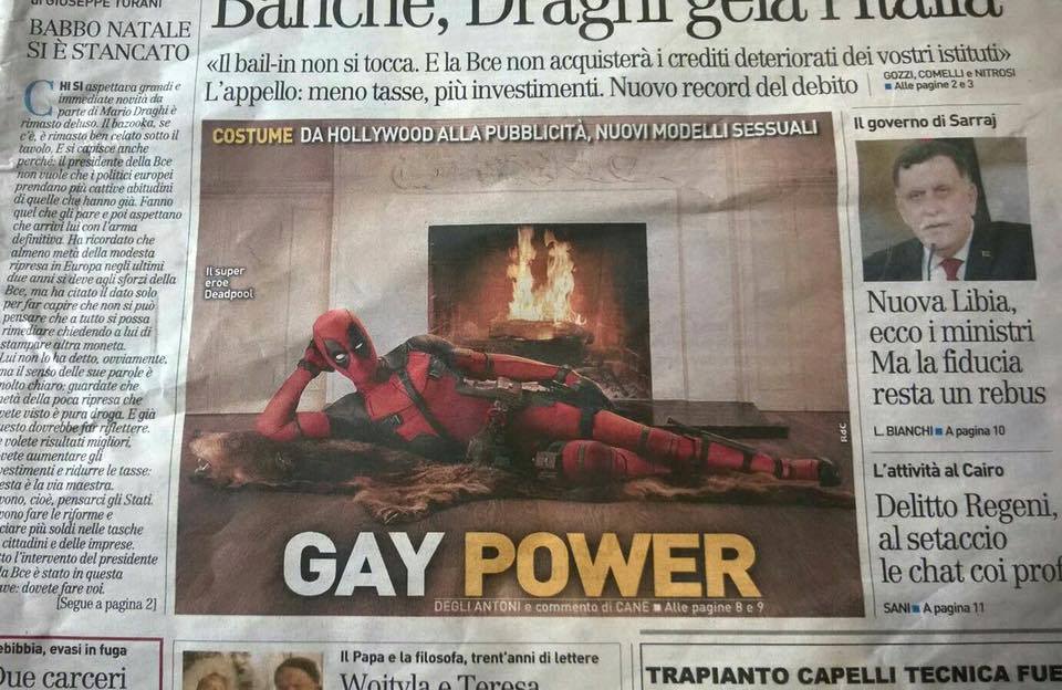Non si è capito che Deadpool, nel suo film (perché di fatto è SUO e non della Fox) sta prendendo per il culo quasi un ventennio di film di genere e, più in generale, almeno 80 anni di fumetti. Deadpool ha smantellato l’eroe, ha smantellato il cinecomics, ed ha continuato un lavoro fatto con film come Guardiani della Galassia, per dare una scossa evidente ad un mercato che comincia a mostrare il fianco alla noia. Ma per una certa fetta della stampa italiana, è più utile filosofeggiare sulle attitudini sessuali del personaggio (che tra le altre cose nel film vive una solida e profonda relazione ETERO) che su tutto il resto.