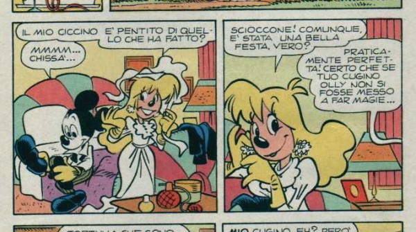 Tornati in città come marito e moglie, fa la sua comparsa una vignetta molto discussa, che vede Topolino intento a rivestirsi sul letto, in una scena che in realtà leggendo la storia è molto più innocente di quanto si possa immaginare. Ma la frittata ormai è fatta. Qualcuno gridò allo scandalo, tanto che la voce che “Topolino si è sposato e ha pure fatto sesso!” arrivò fin negli Stati Uniti, che ordinarono la distruzione delle tavole originali della storia, difatti mai ripubblicata.