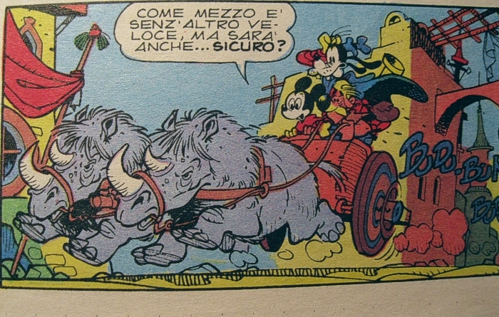 Prima grande parodia Disney, quella scritta da Guido Martina e disegnata da Angelo Bioletto è una storia, perdonate il gioco di parole… storica. Datata 1949, fu fino agli anni ’80 l’unica storia per la quale venne specificato il nome degli autori (l’unica altra firma possibile era infatti quella di Walt Disney), come segno di apprezzamento dello stesso Disney, cui piacque moltissimo. Il lavoro di Martina fu infatti talmente certosino da recare all’interno di ogni vignetta una didascalia in terzine con versi endecasillabi (in metrica sono versi composti da 11 sillabe, con accento sulla decima) in rime incatenate ABA/BCB, ossia gli stessi usati da Dante per la Divina Commedia.