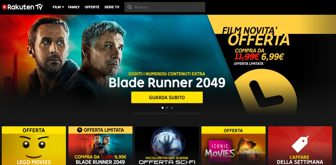 Il catalogo è senza dubbio molto fornito, potendo contare su un ricchissimo archivio per i film del passato, ed il prezzo varia anche in base alla data di uscita; quindi ad esempio l’acquisto di Iron Man (2008) avrà un costo di 2,99 euro, mentre ovviamente IT costerà 11,99 euro e Cars 3 13,99. Ma ci sono anche le offerte, a cui Rakuten dedica un catalogo esclusivo ed in evidenza, e in cui ad esempio al momento trovate Blade Runner 2049, a soli 6,99 euro anziché 11.99. E ancora ci sono offerte divise per categorie, oppure l’Affare della settimana, con una selezione di film al 50%, dove potrete al momento trovare anche prodotti qualitativamente interessanti come Star Trek Beyond o La pazza gioia di Virzì.