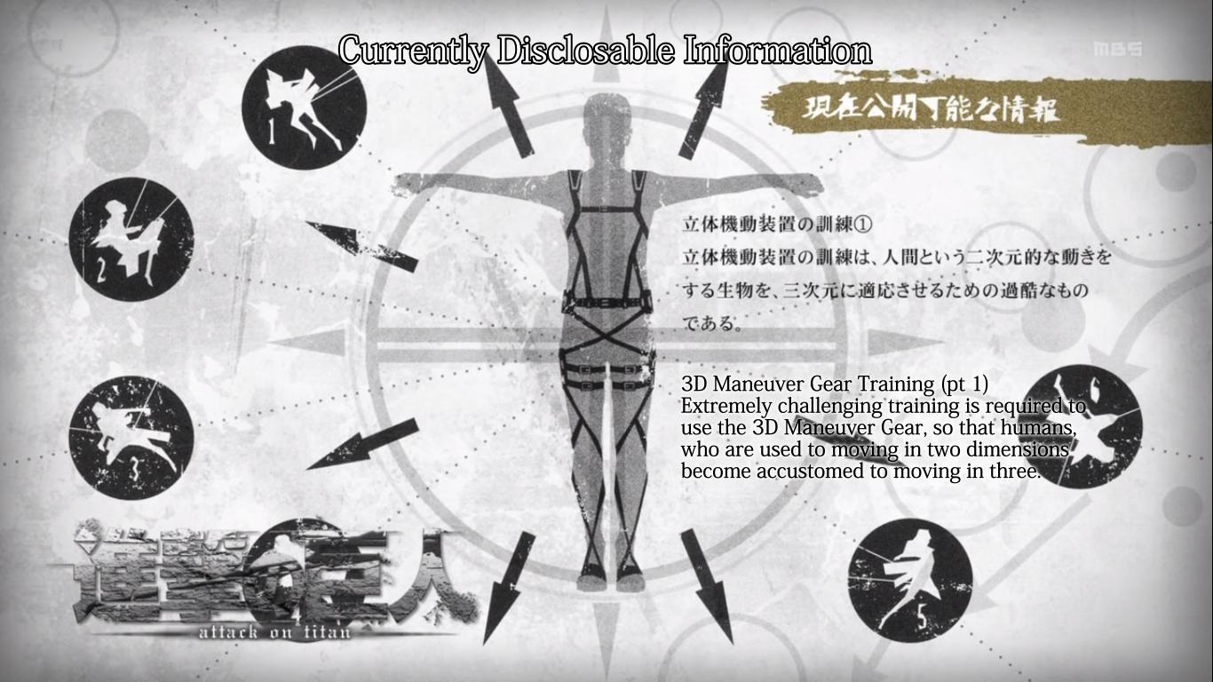 Il Meccanismo di Manovra Tridimensionale è scientificamente provato come il miglior metodo esistente per abbattere i Titani. Agendo in tre dimensioni, permetterà all’utilizzatore esperto di muoversi ad alta velocità e di sferrare attacchi fulminei che sorprenderanno i mostri senza possibilità di appello. Certo, l’area da poter colpir è minima, corrisponde unicamente alla collottola del gigante, ma questo ha mai fermato qualcuno dal compiere un’eroica missione suicida?