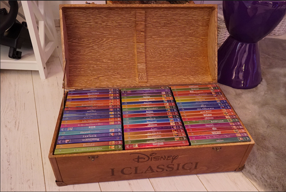 Si tratta di un vero e proprio forziere contenente 52 DVD di tutti i classici d’animazione Disney usciti fin’ora, da Biancaneve e i Sette Nani a Frozen.