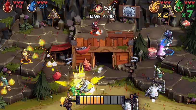 Nella modalità Arcade, invece, l’obiettivo è quello di fronteggiare, da soli o con l’aiuto di altri giocatori, 25 ondate di temibili, temibili orsetti. Badate bene, però: i primi potranno sembrare pucciosi e morbidosi, e non riusciranno a fare altro che stordirvi per qualche secondo qualora riuscissero a colpirvi, ma dopo alcune ondate inizieranno ad arrivare i fratelli maggiori armati fino ai denti! All’inizio della partita, ciascun giocatore avrà a disposizione 3 vite per arrivare alla fine delle 25 ondate, e qualora dovessimo esaurirle e venir sconfitti durante una di queste, spetterà ai nostri compagni d’arme eliminare tutti i rimanenti nemici dell’ondata prima dello scadere del timer per riportarci nella lotta. A mano a mano che riuscirete a superare le prime sfuriate, inizieranno ad apparire diverse tipologie di nemici (5 in totale), dall’orso arciere, che vanta la nostra medesima potenza di fuoco, fino all’orso armato di bazooka e corazzato che richiede più di qualche colpo per essere buttato giù. Ed in queste fasi avanzate, anche un semplice e inoffensivo orsetto potrebbe immobilizzarvi quel tanto che basta per ricevere un colpo da uno dei suddetti fratelloni ed essere causa della vostra disfatta! Nonostante questo, però, sconfiggendo ciascun nemico sarà possibile raccogliere delle sfere energetiche, che una volta accumulate in un certo numero permetteranno di attivare una sorta di roulette dei power-up, grazie alla quale verrà fornito a ciascun giocatore in vita un potenziamento casuale. In aggiunta a (quasi tutti) quelli disponibili in modalità Arena, nell’Arcade sarà possibile ottenere anche una vita extra o una cospicua quantità di denti d’orso, la valuta del gioco per sbloccare le personalizzazioni.