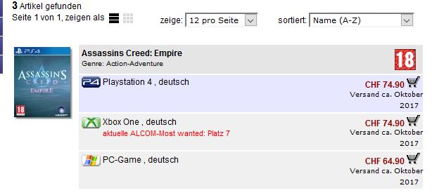 Notizia di oggi è che un rivenditore svizzero, Alcom, ha messo in listino un certo Assassin’s Creed Empire, che potrebbe essere proprio il nuovo episodio della saga, e che stando alla pagina prodotto nel sito, dovrebbe uscire ad ottobre su PlayStation 4, Xbox One e PC.