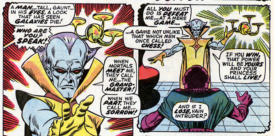 “In cosa consiste questo gioco?”, chiedono gli Avengers. Si tratta di una pericolosissima partita a scacchi dove le pedine sono gli Avengers stessi, che dovranno sfidare dei campioni scelti dal Gran Maestro in persona. A quel punto, l’Antico dell’Universo decide di mostrarsi ai presenti, confermando la versione di Kang. I Vendicatori accettano, pronti a tutto per salvare la Terra. Allora, l’entità cosmica usa i suoi straordinari poteri per teletrasportare Capitan America, Goliath e Thor in luogo imprecisato. Il gioco ha così inizio.
