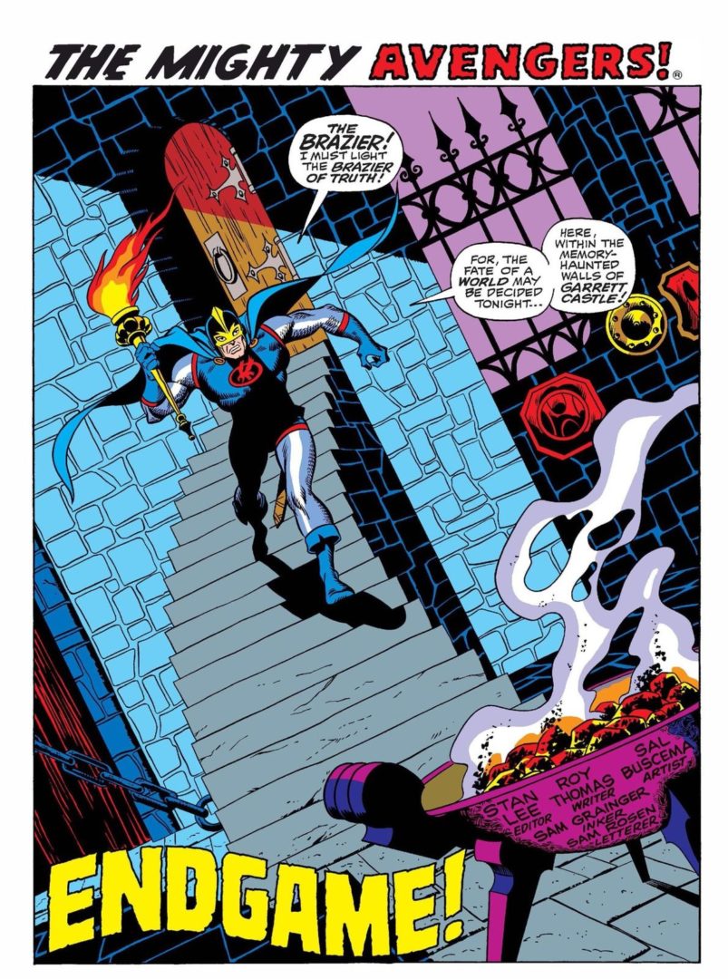 Come abbiamo detto, il primo albo chiamato “Endgame!” (col punto esclamativo, che allora era un’immancabile presenza) è un classicone realizzato in coppia da Roy Thomas e Sal Buscema. L’albo è il numero #71 della testata The Avengers, che ha da poco ripreso il suo nome storico dopo la parentesi “The Mighty Avengers“, ed esce a dicembre del 1969. Sulla copertina, d’incredibile impatto, vediamo la consueta scena di battaglia, una tradizione del periodo visto che l’intenzione era quella di attirare subito l’attenzione del lettore, spesso giovane o giovanissimo.