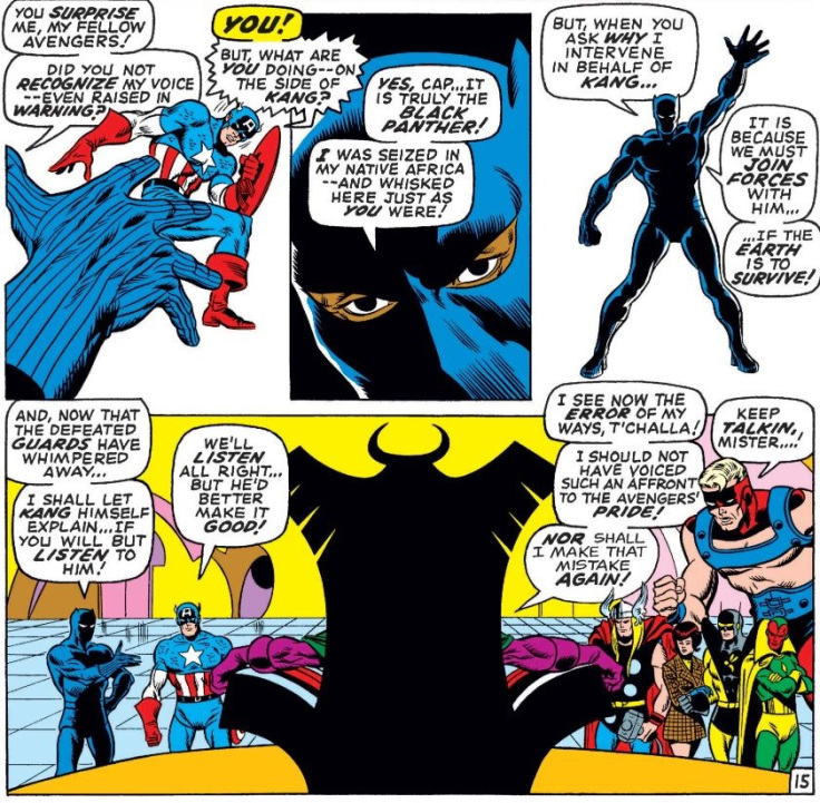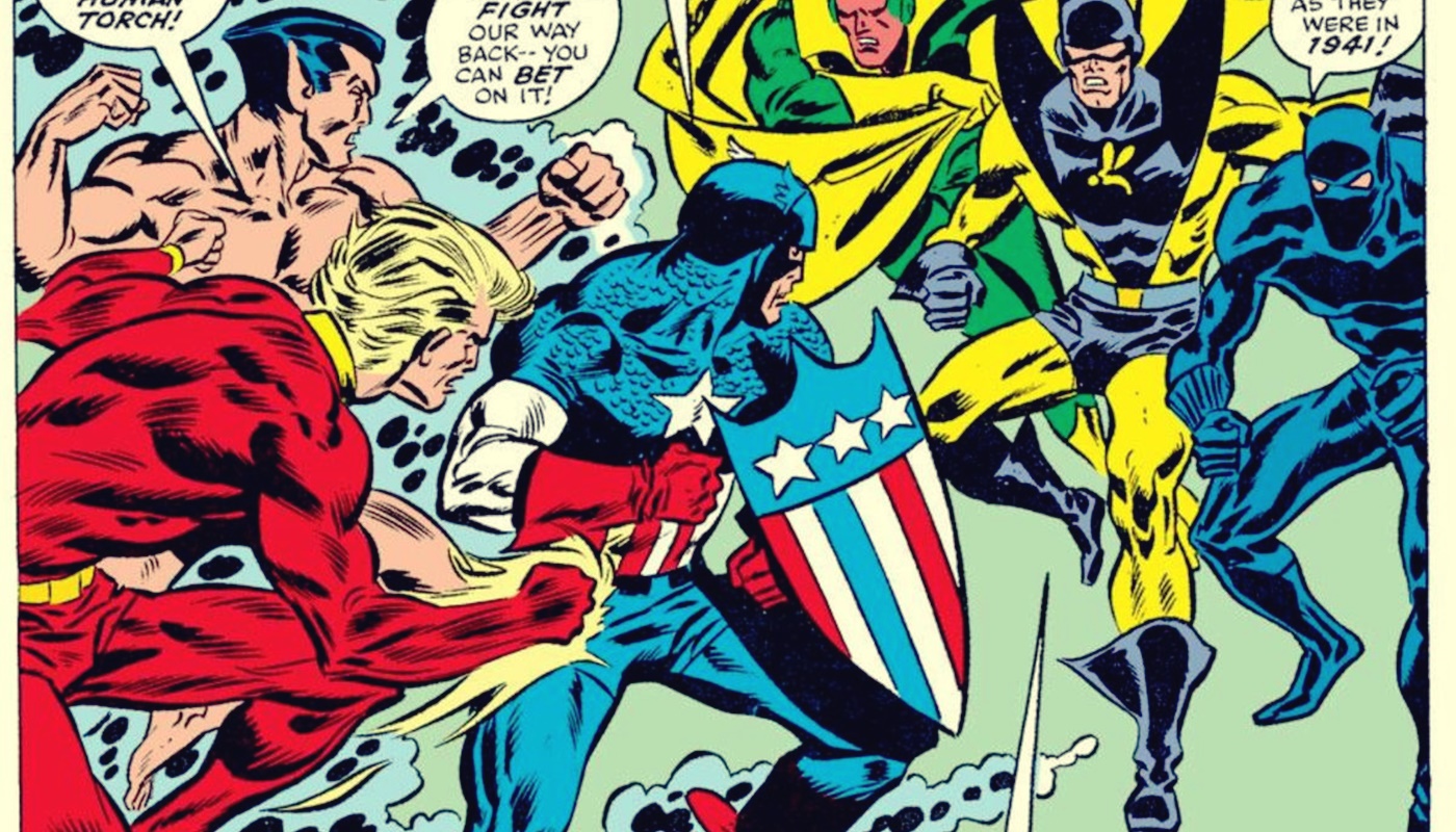 Gli Invasori sono una creazione originale (una tra le tante) di Roy Thomas, il quale rivoluzionò l’Universo Marvel ipotizzando che, durante la Seconda Guerra Mondiale, Capitan America e Bucky avessero combattuto al fianco degli altri volti storici degli anni ’40 come Namor il Sub-Mariner, Toro e la Torcia Umana Originale, i primi supereroi della Timely Comics. Una sorta di Avengers ante litteram, per intendersi. Ecco spiegata, dunque, la copertina: la Visione, Pantera Nera e il Calabrone si trovano ad incrociare i pugni con gli eroi degli anni ’40 durante l’occupazione tedesca. Nel frattempo, il Cavaliere Nero trova gli Avengers imprigionati da Kang dopo la loro vittoria contro lo Squadrone Sinistro e li libera.