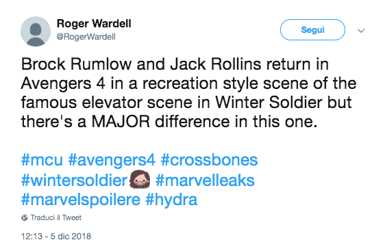 I due successivi spoiler su Steve Rogers hanno in effetti riguardato la nuova versione della scena dell’ascensore vista in Captain America: The Winter Soldier e la citazione ai fumetti, nello specifico alla frase “Hail Hydra”, la stessa che ha portato all’evento Secret Empire.