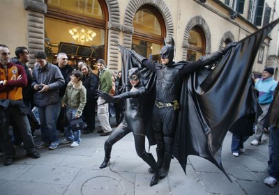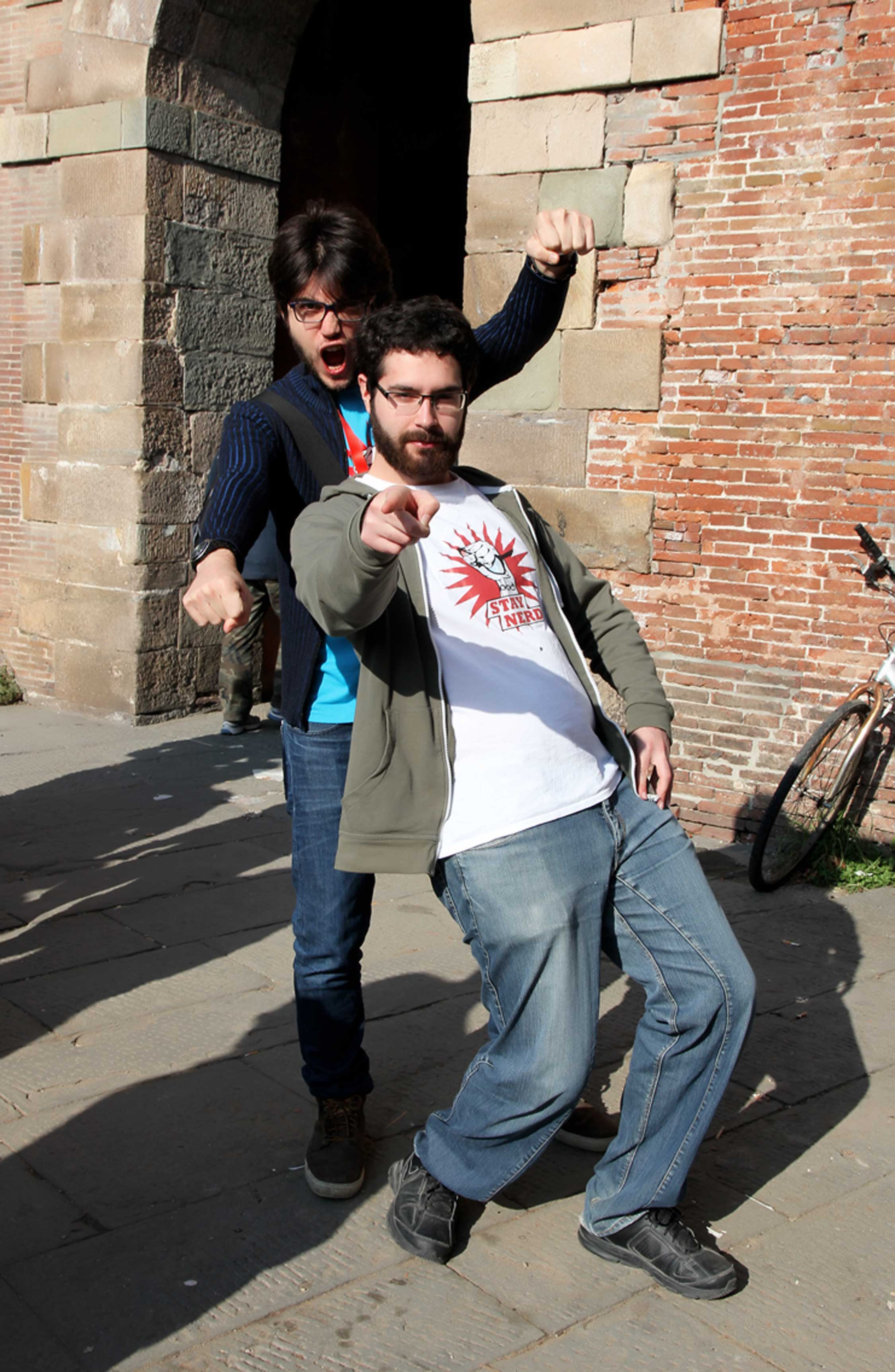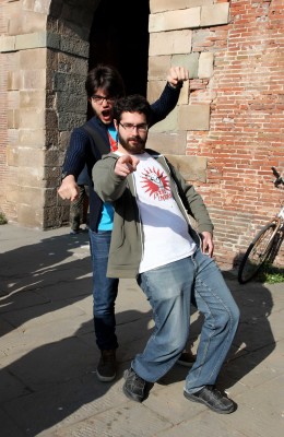 Un attimo di digressione: forse vi starete chiedendo perché non parlo di bancarelle, della merce mostrata o magari dei film proiettati: la risposta è una domanda. Come cazzo era possibile farlo se a malapena potevi muoverti dentro e tra gli stand? Sul serio, ho visto pochissimo dell’oggettistica del Games e NULLA dei fumetti, sono a malapena riuscito a comprare Ratman mentre si aspettava l’intervista a Deodato. Tornando al discorso principale, uscito dalla mostra scoprii che l’intervista era saltata, visto la marea di gente che smaniava per lui. A quel punto io avevo finito le cose da fare, mi rimaneva solo dare spille e adesivi. Prima fu provato il sistema di accattonaggio 1: andare in giro a chiedere se le volessero, poi il sistema 2: sedersi sugli scalini col cartello e sperare che la gente fosse interessata. Nulla per entrambi. Il successo si trovò nel metodo 2.41: uscire dal cortile del palazzo ducale, mettersi a lato della strada con le spille in una mano e adesivi nell’altra, a mostrare il prodotto senza dire nulla. La mia idea era che se la gente voleva i nostri gadget, li avrebbe presi. E fu così, le spille andarono via come il pane, costringendomi a riempirmi le mani più volte. Quello fu un momento di soddisfazione, perché le nostre spille sono parecchio fighe. Da qui in poi non è successo nulla di veramente interessante, ho incontrato i miei cari amici dopo che ci inseguivamo da due giorni, ma non c’è nient’altro che riguardi la pagina in sé. Dato il tremendo casino coi treni fui riportato a Firenze SM Novella, dove partii diretto per Arezzo dopo aver salutato tutti ed essermi buttato fuori dall’auto perché i semafori mi stavano facendo far tardi. E anche il treno di ritorno era scassato. FUCK! FUCK! FUCK! FUCK!