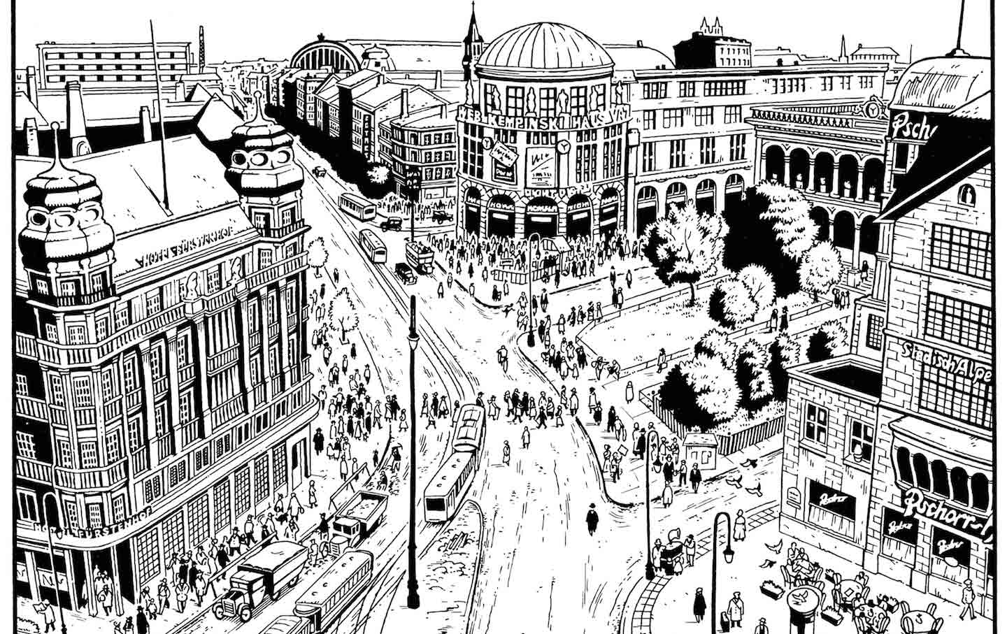E così veniamo a conoscenza dei grandi sommovimenti, politici e religiosi, che animano i quartieri disagiati, attraverso gli occhi della madre comunista Gudrun Braun e poi di sua figlia Silvia, di David Schwartz e Pavel, due “rossi” di origine ebrea che provano sulla loro pelle le prime avvisaglie di quell’antisemitismo che diventerà la bandiera del Nazismo e che porterà all’Olocausto. Nonostante questo caleidoscopio di umanità, già di per sé vasto e prolifico, Lutes aggiunge ancora inserendo personaggi che rappresentano quella classe media da sempre è il vero agente patogeno delle dittature e delle svolte autoritarie. Perché, esattamente come accadde col Fascismo in Italia, sono stati i Secondi, non gli Ultimi, a permettere l’ascesa degli “uomini forti” per proteggere i propri interessi e il proprio stile di vita. Senza trascurare le figure senza nome, che fanno capolino ogni tanto tra le inquadrature di Berlin, quelle che vediamo parlare per una pagina o anche solo per una vignetta e poi spariscono per sempre, che però svettano grazie alla loro forza comunicativa e che si uniscono ad un coro che parla con la melodia stessa di una città in perenne cambiamento.