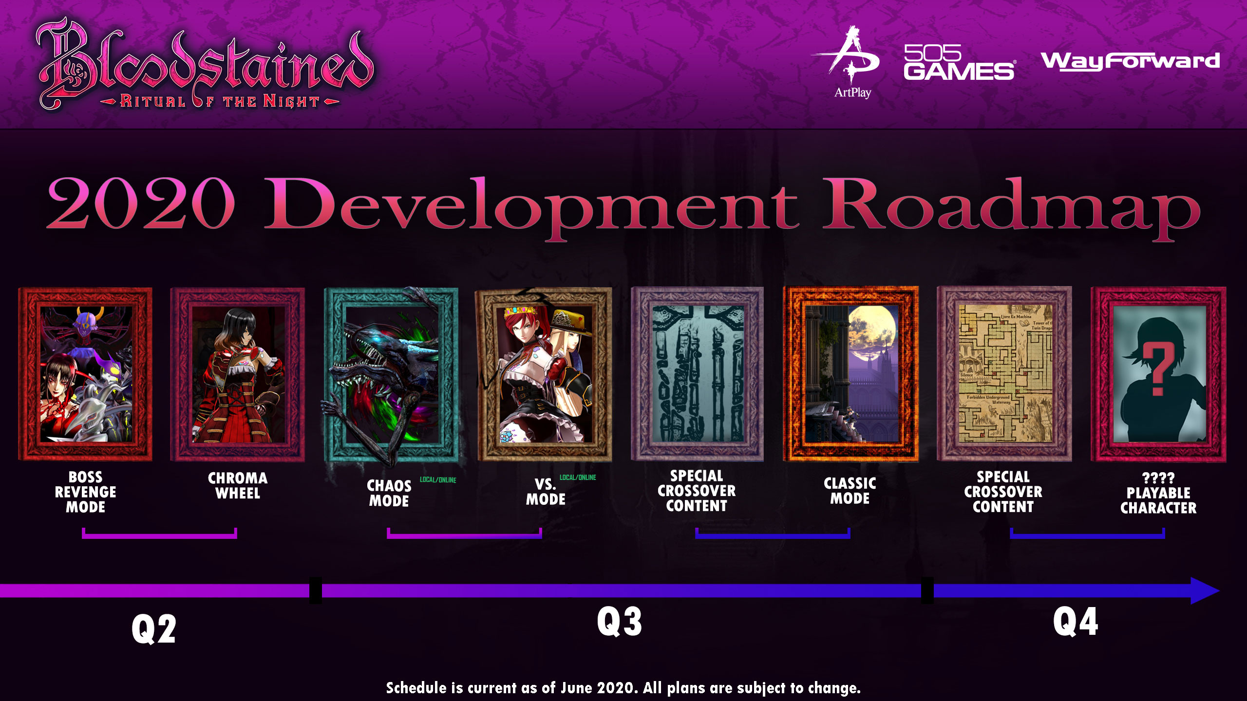 Come potete vedere dalla roadmap di Bloodstained: Ritual of the Night, si inizierà il 23 giugno con una nuova Modalità “Boss Revenge” e maggiori opzioni di personalizzazione con la Ruota Cromatica, per i giocatori PC, PlayStation 4 e Xbox One, i fan saranno trattati a un flusso costante di contenuti e funzionalità gratuite per tutto il resto dell’anno. L’obiettivo di questi contenuti gratuiti è di migliorare l’esperienza di gioco e offrire più modi per interagire con il titolo indie di debutto di Koji Igarashi, tanto acclamato dalla critica.
