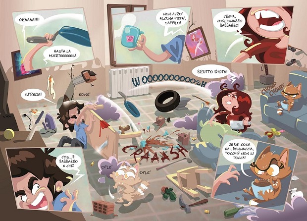 Già dalle primissime pagine di questo Bulle e Pupi veniamo catapultati in una successione serratissima di scenette tipiche della vita di coppia, tradotte (o forse travolte) dall’umorismo totale degli Autori. Chi conosce la “serie” dai tempi del Web ormai sa fin troppo bene cosa aspettarsi. Per gli altri, in poche parole: avete presente la classica satira delle relazioni sentimentali? Pompatela di steroidi, ficcateci qualche citazione della cultura pop e fatele un bagno di attualità (quella vera, non la sedicente “attualità”, che poi attuale non è mai). Il risultato si avvicina all’euforico volume macina-gag che è Bulle e Pupi.
