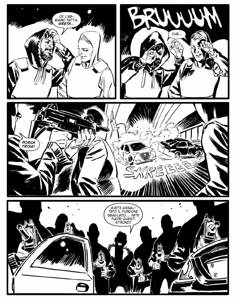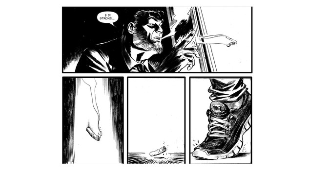 Già questo è un elemento fondamentale: in Caput Mundi si parla romanaccio, tanto che qualche non-romano potrebbe storcere il naso, ma anche qualche romano, a dir la verità. Nei fumetti, così come nei libri, i dialoghi sono soltanto la simulazione di un colloquio reale, ma non ne imitano pedissequamente l’andamento. In un romanzo (sia “graphic” che non) non si parla come si parla nella realtà, e questo è uno dei motivi per i quali il dialetto è assurto a tabù della letteratura scritta. Intendiamoci, di recente questa tendenza, che era comune anche ad altri media d’intrattenimento, si è fortemente invertita: Romanzo Criminale e Gomorra sono solo due esempi della forza che il dialetto ha conquistato anche nei confronti di chi, questo o quel gergo particolare, non l’ha mai parlato né compreso, e già il Commissario Montalbano, tra libri e serie TV, ci aveva pensato, seppur più timidamente. L’uso del romanaccio, quindi, non è di per sé problematico, ma è comunque un tantino esagerato, non certo per il contesto quanto per l’intensità con cui s’impone, brutale come i suoi personaggi, perfettamente coerenti, ma forse troppo nei confronti dei suoi lettori. Certo, il target caput-mundiano non può che essere estremamente romano, ma proprio questa ricercata romanità è già presente nei personaggi, nelle ambientazioni, nel contesto che si respira attraverso scorci popolari e sguardi di sottecchi. Va bene che si parli anche un po’ romano, con buona pace dei fumettisti e letterati più tradizionalisti, ma anche quest’elemento, come tutti gli altri, non dev’essere esagerato. Come il sale sulla pasta: né troppo, né troppo poco.