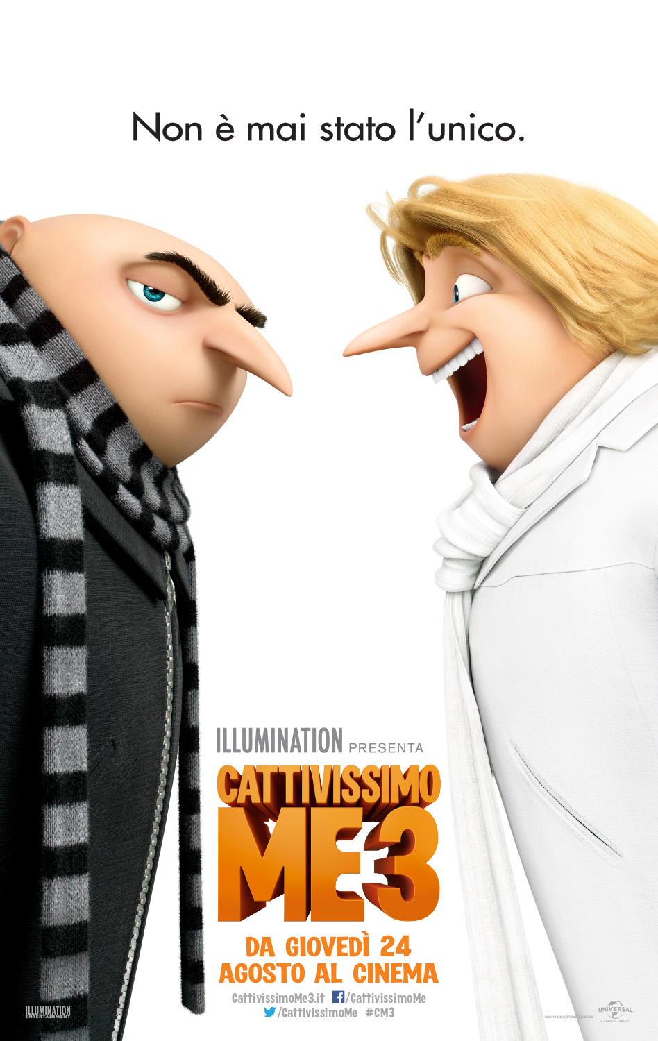 Con Illumination – lo studio che ha creato Sing, Pets – Vita da Animali e la franchise Cattivissimo Me – continuano le avventure di Gru e della sua famiglia in Cattivissimo Me 3. Dopo essere stato licenziato dalla Lega Anti-Cattivi per non aver arrestato Balthazar Bratt (con la voce di Paolo Ruffini), la nuova mente criminale pronta a minacciare l’umanità, Gru (doppiato da Max Giusti) si ritrova nel pieno di una profonda crisi d’identità. Ma quando un estraneo misterioso appare per informare Gru che ha un fratello gemello di cui non ha mai saputo nulla – un fratello che vuole disperatamente seguirne le cattivissime orme – l’ex super-cattivo (affiancato dall’adorata Lucy, con la voce di Arisa) riscopre quanto sia fantastico essere malvagi.