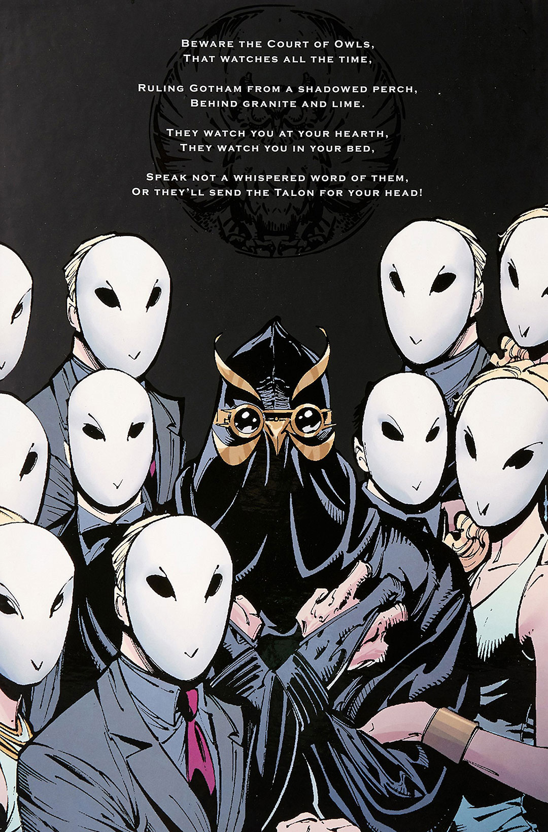 Le strade dei paladini di Gotham ideate da Snyder, si incroceranno presto con quella di un’organizzazione secolare nota come la Corte dei Gufi e considerata, fino a poco tempo prima, una semplice leggenda metropolitana, una sorta di uomo nero ideato per spaventare i bambini e legato alla seguente filastrocca: