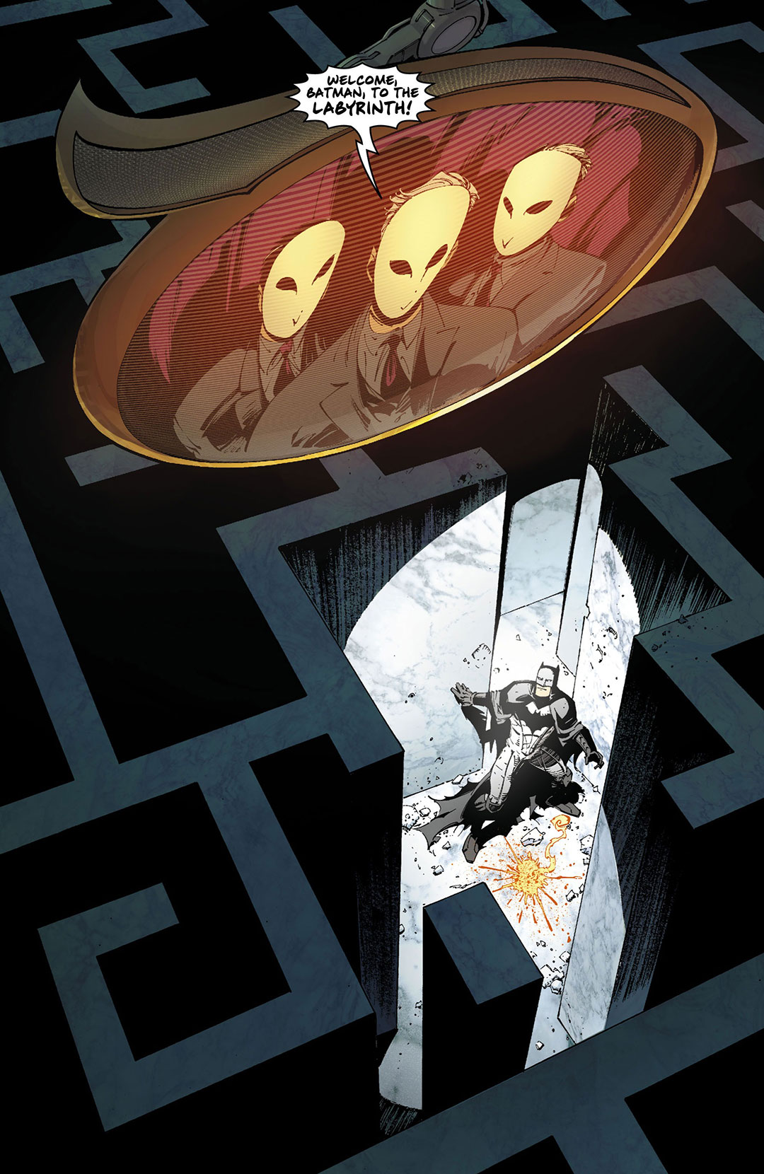 Finito nella tana del bianconiglio – e no, stavolta il vecchio Tetch non c’entra nulla, si tratta solo di una metafora – Batman scoprirà che la Corte si è resa colpevole della morte di decine e decine di persone, tra le quali anche Alan Wayne, antenato di Bruce e fondatore di buona parte di Gotham City, dato per morto in un tragico incidente che lo vide precipitare e annegare nelle fogne della città. La follia che sembrava guidare Alan Wayne la notte della sua dipartita, è la stessa che la Corte tenterà d’instillare nella mente del Cavaliere Oscuro, trascinandolo in un labirinto fatto di ansie, paure e paranoie – rappresentato in maniera straordinaria da Greg Capullo – e controllato dal sempre vigile sguardo di un Minotauro sottoforma del rinato Artiglio, pronto a ghermire la propria preda una volta resa completamente inerme dalla follia.