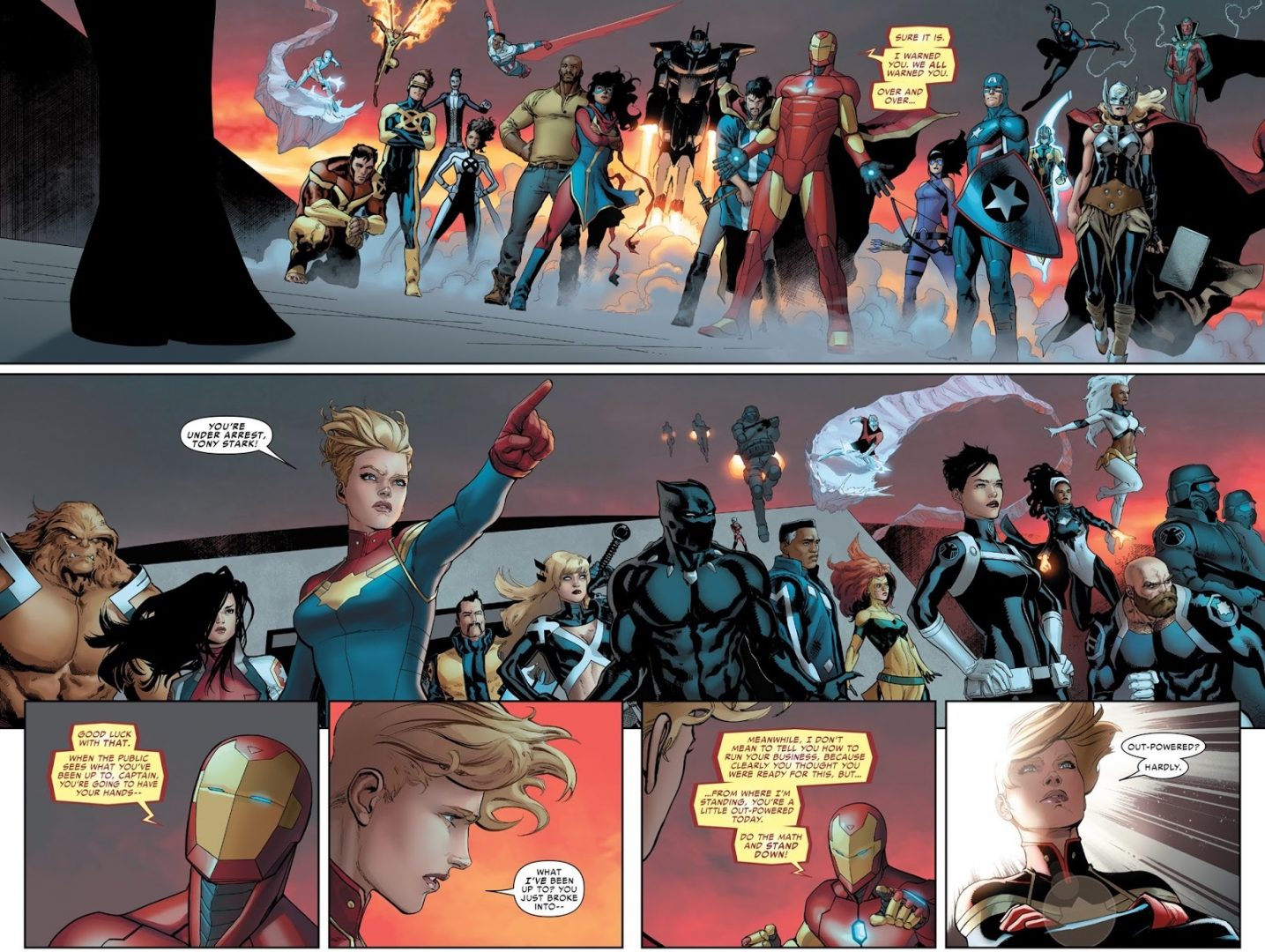 In due parole: Cap. Marvel agisce in maniera esageratamente rigida e dittatoriale, uscendo dal proprio personaggio; di contro, Tony Stark appare in maniera sin troppo evidente come leader della fazione ragionevole. Attorno a loro, e questo si è concretizzato proprio nel numero scorso, si sono riunite due “squadre”, accomunate da ragioni politiche o di amicizia, più che di accordo e di opinione. Eppure il dilemma etico era convincente e altamente divisorio: è lecito punire qualcuno in anticipo, se si sa con una buona, ma non totale, probabilità che compirà qualche crimine nel futuro?