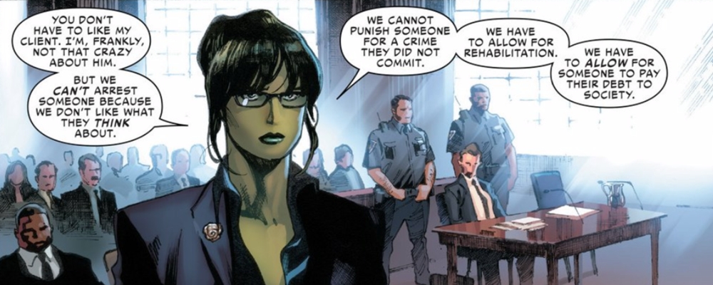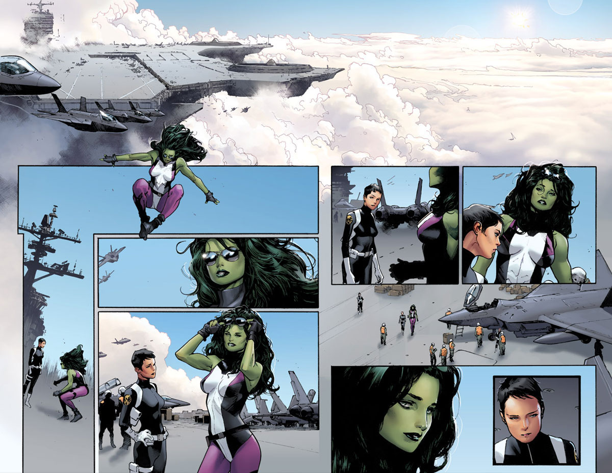 Sullo stesso tema vertono anche le scene dedicate a Jennifer Walters aka She-Hulk, nella veste di avvocato difensore di Jonathan Powers, un ex-supercriminale di bassa lega (Jester) accusato sulla base di intercettazioni telefoniche, e nessun crimine, e War Machine (alias di James Rhodes, tra l’altro recente fiamma proprio di Cap. Marvel), in azione a Latveria, impegnato a prendere la situazione di guerriglia sotto l’ala “protettiva” degli Stati Uniti. È facilissimo intuire quale sarà il tema della saga e dello scontro: è giusto agire in anticipo rispetto ai problemi? O la cosa finisce per privare gli esseri umani, persino se criminali, dei loro diritti, del loro libero arbitrio? Voi da che parte stareste?