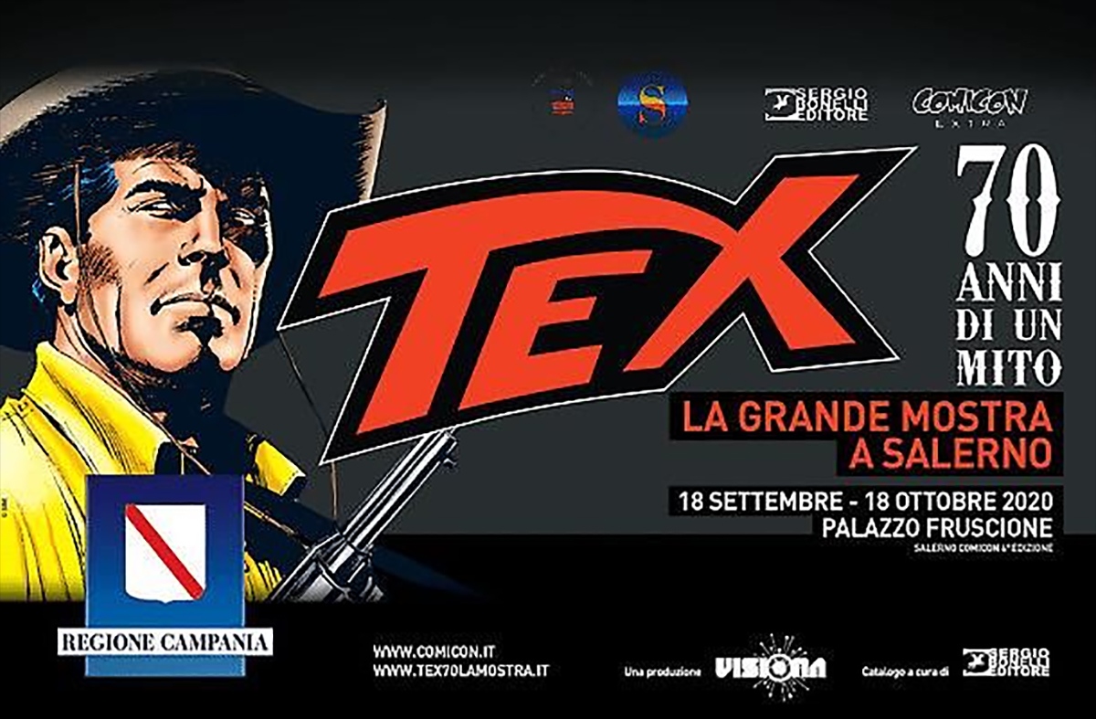 Aprirà venerdì 18 settembre, al Palazzo Fruscione di Salerno, la nuova tappa della mostra Tex: 70 anni di un mito (18 settembre – 18 ottobre 2020). La mostra è organizzata nell’ambito del programma “COMICON Extra”, realizzato grazie al sostegno della Regione Campania. L’esposizione è curata da Gianni Bono, storico e studioso del fumetto italiano, in collaborazione con la redazione di Sergio Bonelli Editore e COMICON.
