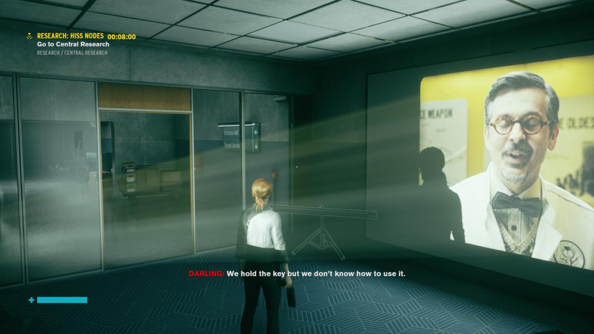Eventi che si appoggiano su un background sconfinato, ma non sbattuto in faccia al giocatore, che avrà l’onere e l’onore di scoprirlo con piena partecipazione. Control dona il meglio di sé infatti solo all’utente più diligente che osserva e studia quello che il gioco offre. Non ci sono spiegoni chilometrici preventivi nel viaggio di Jesse nei meandri del gargantuesco edificio esplorato -nossignore- lo stretto indispensabile ci viene detto solo a tempo debito, e la comprensione dello stesso sarà sempre subordinata ai puntini che autonomamente saremo in grado di collegare tra le decine di file e video rilevati sul posto, e l’attenta osservazione dell’ambiente circostante.