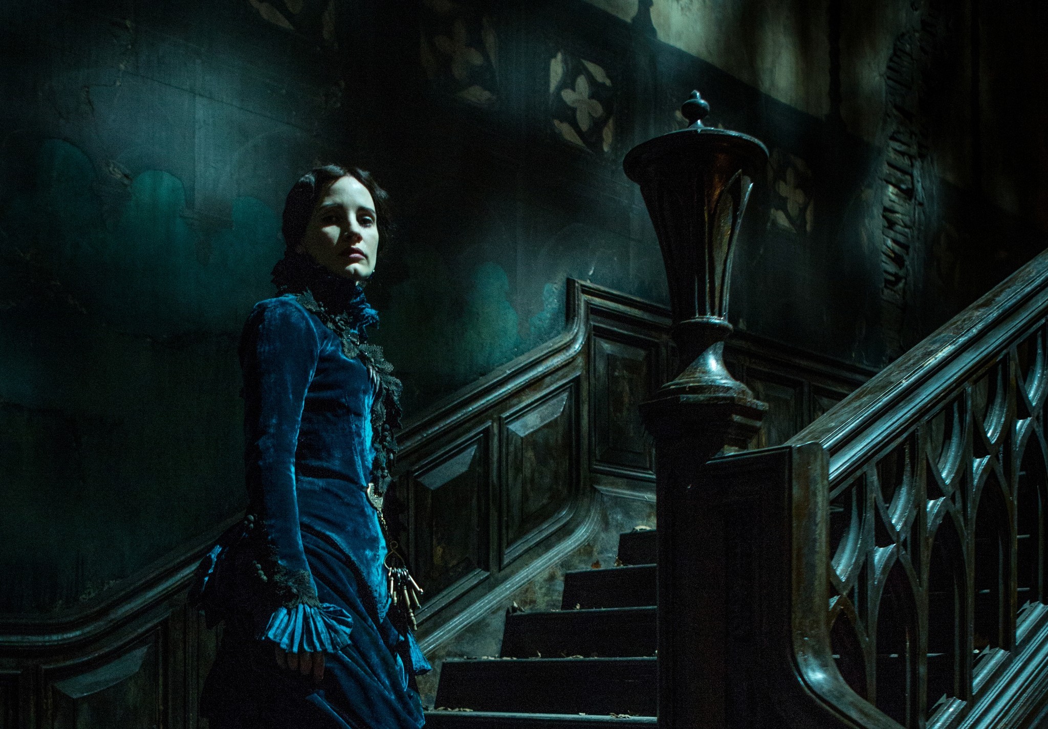Sullo sfondo di una cupa Inghilterra del diciannovesimo secolo, Edith Cushing (Mia Wasikowska), giovane benestante con il sogno nel cassetto di diventare una affermata scrittrice e figlia di un importante imprenditore, conosce e si innamora di Sir Thomas Sharpe (Tom Hiddleston), misterioso rampollo di una famiglia di nobili origini. In seguito ad una serie di drammatici eventi, Thomas porterà la bella Edith a vivere nella sua fatiscente e lugubre magione, insieme alla altrettanto inquietante sorella. La costruzione degli eventi che porteranno al trasferimento di Edith, è giostrata con gran maestria da del Toro, che si prende i suoi tempi per articolare a dovere i suoi personaggi, le loro sfumature caratteriali, luci, ombre e ambiguità di sorta. Insomma, quando il film comincia veramente, ovvero quando Edith si trova a dover scoprire i segreti di una villa che già dalla prima inquadratura fa intuire quanti macabri misteri celerà dietro ogni angolo, i tempi sono maturi per stupire e perché no spaventare lo spettatore. Il problema sorge quando scopriamo che nonostante l’ottima atmosfera che il film riesce a ricreare, frutto di una immaginazione e capacità espressiva davvero vivida del nostro del Toro (che in quanto a scenografie e ricercatezza del particolare e del dettaglio, ha ben pochi euguali), il coinvolgimento stenta un po’ a catturarci, a causa di diversi fattori. Innanzitutto, le “apparizioni” dei fantasmi, non colpiscono. È vero che siamo più dalle parti della fiaba dark che quelle di un horror che cerca lo spavento a tutti i costi, ma difficilmente si crea reale tensione e il fatto che gli effetti speciali non siano sempre cosi riusciti (i fantasmi sono bellissimi da vedere, ma palesemente finti), complice anche una fotografia cosi satura nei colori, quasi surreale e decisamente fiabesca, non permette di seguire il destino di Edith con il giusto trasporto, mancando un po’ l’obiettivo di riuscire a tenerci sempre sulle spine.