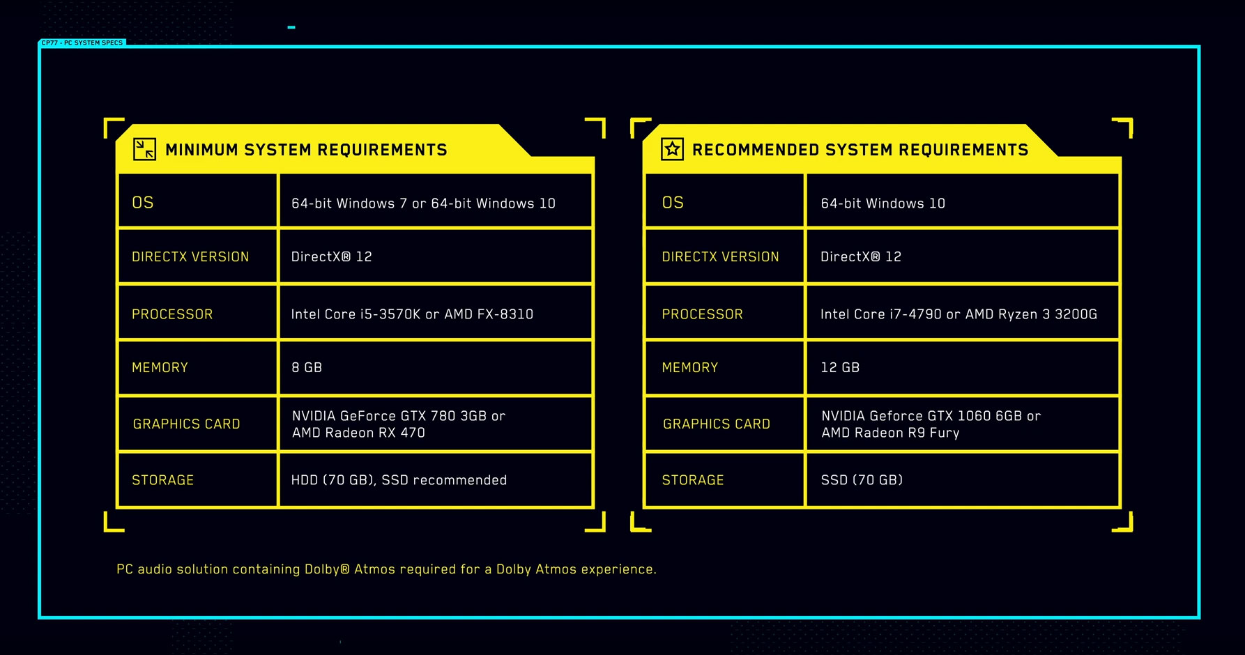 Dulcis in fundo, al termine del Night City Wire, sono annunciati gli attesi requisiti di sistema necessari agli utenti PC per far girare il titolo sulle proprie macchine. Potete vedere i minimi e i consigliati nell’immagine sottostante.