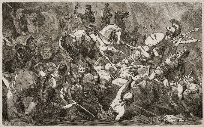 Molti possono pensare che la forza dell’esercito spartano risiedesse nelle loro tattiche o in qualche innovazione bellica, invece Lacedemone non apportò particolari modifiche allo stile della falange oplitica. Una linea di opliti, armati con una lancia, il dory, di una spada, lo xiphos, e protetti da un pesante scudo di bronzo, l’oplon. Lo scudo era molto più di una semplice difesa: esso costituiva un muro impenetrabile con cui lo spartano avrebbe difeso non solo se stesso, ma anche i suoi compagni. La vera forza dell’esercito spartano era infatti questa, lo spirito di gruppo, unito a una ferrea disciplina, che rendevano ogni soldato disposto a combattere non solo per la propria vita, ma anche per quella di chi combatteva al suo fianco.