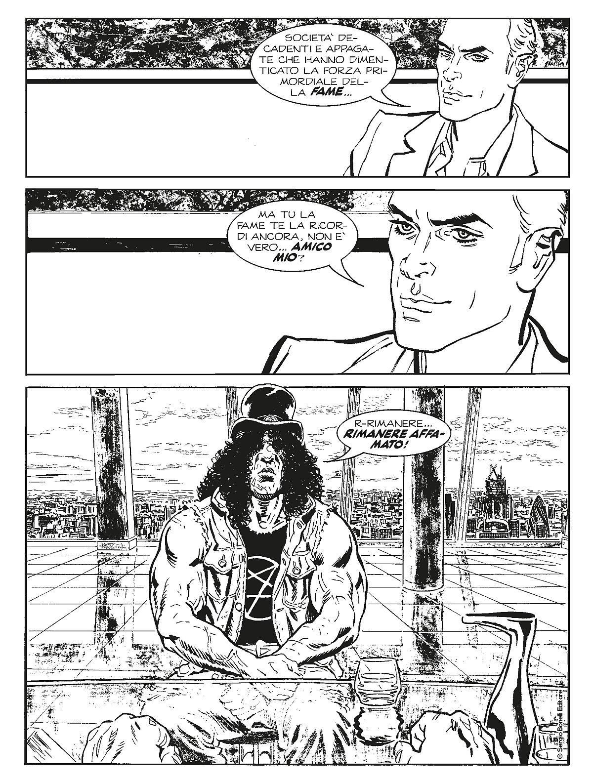 Forse si trattava di una mossa fin troppo scontata, tant’è che Recchioni ha deciso di sparigliare le carte in tavola facendo incontrare il magnate della Ghost Enterprises ad un altro personaggio, meno atteso: Axel Neil, il maniaco capellone ossessionato dalle hit del rock and roll. In realtà anche questo non è un caso: Neil è stato il villain creato da Recchioni in occasione della sua prima storia di Dylan, nel primissimo Color Fest del 2007. Si tratta di un’autocitazione programmatica e indicativa, che ha il sapore dello sliding doors: Ghost e Neil che si incontrano sono il prima e il dopo del curatore che si incrociano e segnano lo scarto, il cambiamento avvenuto in questi anni. Se vi sembra una trovata un po’ troppo referenziale, aspettate: non è finita qui. Questi due personaggi rappresentano anche due fasi (è sempre una questione di fasi) diverse della vita dell’Indagatore dell’Incubo: un “passato” dove il male era personificato da un killer assetato di sangue che simbolizzava gli aspetti più malati della società (in cui ci si poteva dunque riconoscere), ad un “presente” dove il male è invece incarnato da un miliardario senza scrupoli che fa i soldi vendendo telefonini e manipola l’attenzione delle persone con i video sui cuccioli di orso. Il salto può apparire banale, ma non lo è. Prima i “mostri” eravamo noi, adesso i “mostri” stanno sopra di noi. E se pensate che questo sia consolatorio perché si sono allontanati, sono usciti fuori dalla massa, ricredetevi. Perché se i mostri sono sopra di noi e ci controllano, noi cosa siamo?