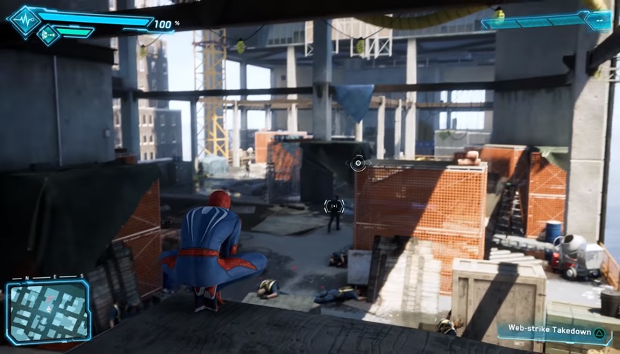 Dopo aver preso a pugni e a colpi di ragnatele altri loschi individui all’interno di una fabbrica, familiarizzando ulteriormente con il sistema di combattimento e il suo apparente dinamismo, eccoci di nuovo su di un tetto, quando veniamo avvisati da Yuri Watanabe che Shocker sta rapinando una banca.