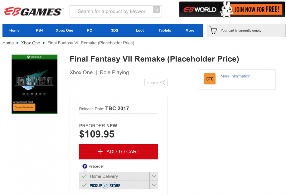 EB Games Australia ha aperto i preordini per la versione Xbox One di Final Fantasy VII Remake, nonostante il gioco non sia mai stato annunciato per la console Microsoft.