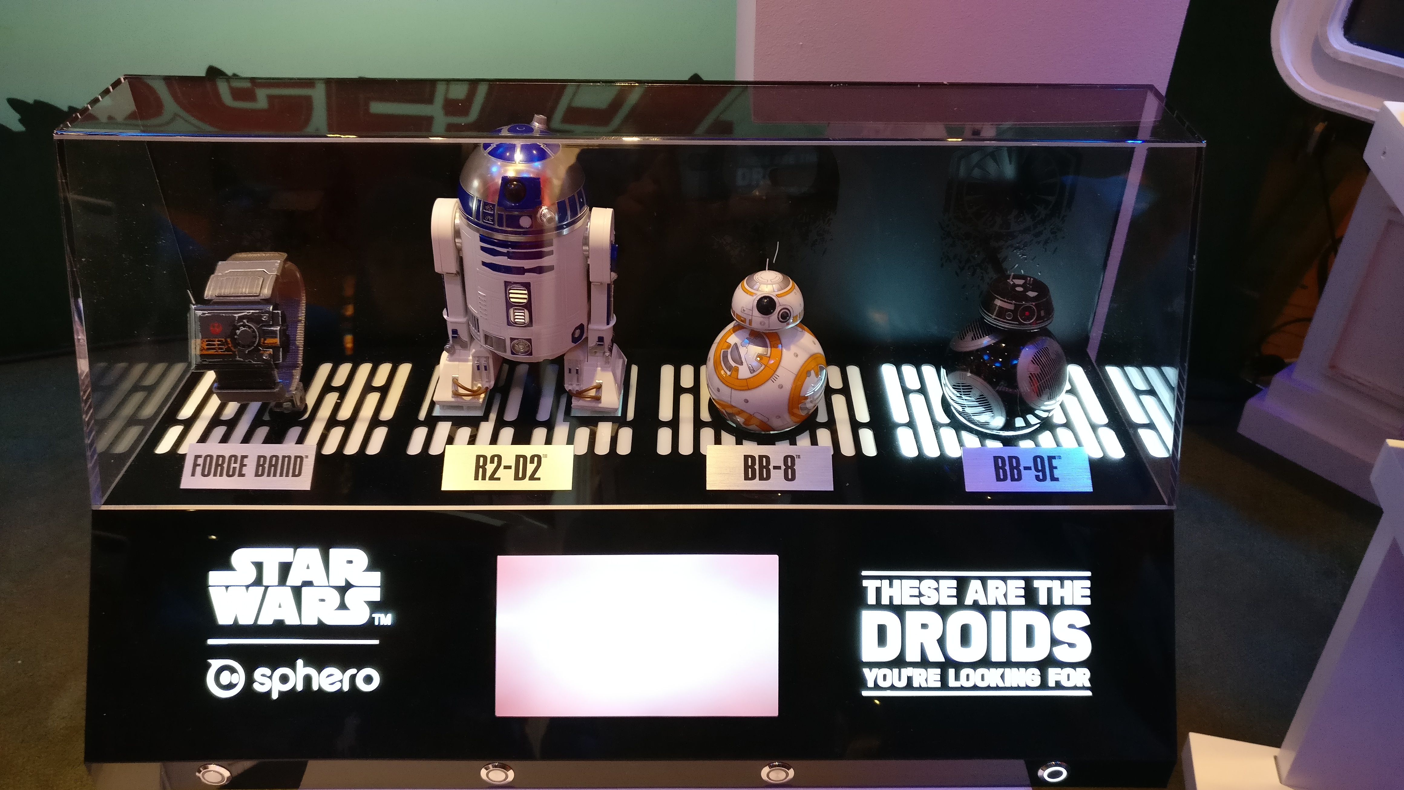 Conclusosi il siparietto, dopo le foto di rito, il tendone rosso si apre, svelando ai nostri occhi mensole e mensole ripiene di ogni sorta di gadget: alle classiche maschere di Darth Vader e Kylo Ren, e alle rispettive spade laser, sono affiancate una serie di Die Cast dei personaggi vecchi e nuovi, Funko Pop dalle forme più disparate, androidi assemblabili e altre meraviglie.