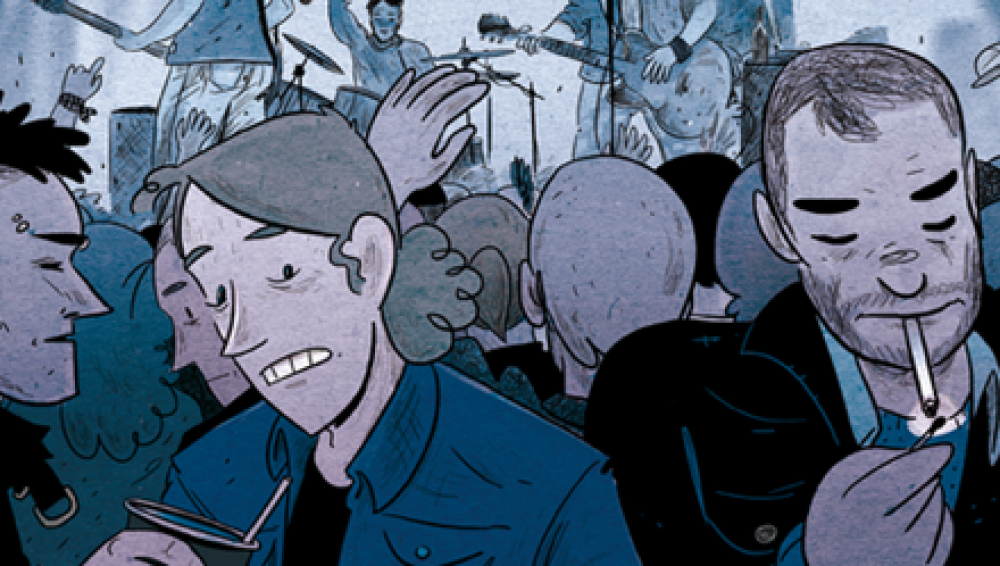 Non c’è colore, non nel senso classico almeno: l’autore ha scelto di disegnare tutto in bianco, blu e nero, riservando il tratto più realistico solo per la rappresentazione degli artisti che si sono esibiti nei due anni d attività del club, associando un disegno più cartoonesco e semplice per il resto del vastissimo cast che naviga tra le oltre 170 pagine di racconto.