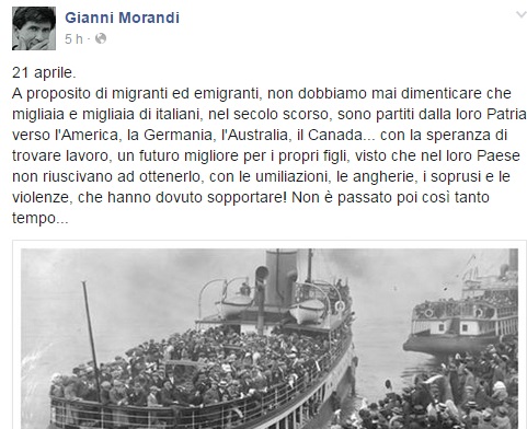tendenza rimani inevitabilmente indietro. Oppure forse il trend ha seguito un meccanismo abbastanza semplice, è nato prima come un fenomeno di nicchia, lentamente si è espanso fino ad avere una certa rilevanza, poi sfruttando un buon catalizzatore è esploso definitivamente. Il catalizzatore per la nuova fama di Gianni Morandi è stato il razzismo. Terreno da sempre fertile per far partire discussioni accese, a maggior ragione quando a dibattere sull’argomento è un personaggio famoso. Il 21 Aprile 2015 Gianni Morandi ha dato a tutti lezioni di storia e di razzismo ricordando, per chi l’avesse dimenticato, che l’Italia è storicamente un paese di emigranti e che per diretta conseguenza gli Italiani hanno subito in America la stessa sorta che tocca ad oggi ad Albanesi, Rumeni e via dicendo qui in Italia. Quel post generò il finimondo: milioni di commenti, tra sostenitori e l’immancabile lerciume del web che appena può riversa tutta la sua rabbia becera, in questo caso riversata nei confronti di Gianni e gli sfortunati emigranti che ha tentato giustamente di difendere.