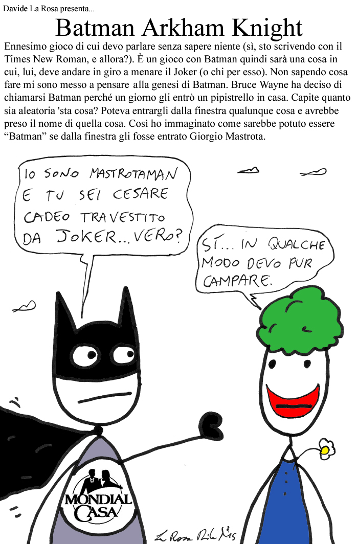 Diciamocelo, i tie-in il più delle vostre si rivelano come giochi mal progettati, inutili e adatti solo ad un pubblico cerebroleso che comprerebbe qualsiasi cosa finché sulla copertina c’è un personaggio di successo. Quando qualche anno fa arrivò Batman: Arkham Asylum pensai ecco, Batman ritorna sulle console nel peggiore dei modi. Per fortuna non fu così. Il nuovo filone videoludico di Batman, forse anche più degli ultimi film, uscita dopo uscita non ha fatto altro che convincerci. Potevamo non assegnare il Gioco del Mese di Giugno a Batman: Arkham Knight? Certo che potevamo! Potevamo assegnarlo a qualsiasi altro gioco, ma che credibilità avremmo avuto? E quindi eccoci qui, ad elogiare l’ennesimo titolo riuscito di questa “saga” e a sbellicarci dalle risate con la maestria di Davide La Rosa che anche questo mese è andato alla ricerca dei parallelismi più assurdi tra videogames e usi e costumi della nostra società.