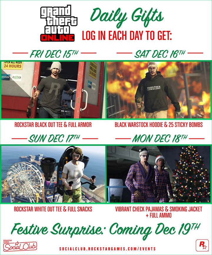Oltre alla lista dei regali giornalieri, che trovate di seguito, i giocatori potranno anche ricevere doppi stipendi in GTA$ per associati e guardie, e approfittare degli sconti offerti da Ammu-Nation.