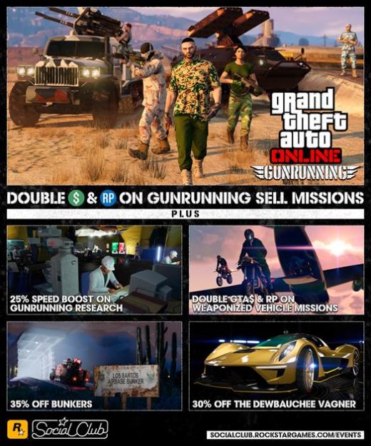 Per tutta la settimana, da Warstock Cache & Carry sconti fino al 40% su una vastissima gamma di veicoli armati ed elicotteri. I trafficanti d’armi potranno approfittare anche di sconti del 35% sui bunker in cui organizzare le proprie operazioni e su potenziamenti Mk II, personalizzazioni e munizioni.
