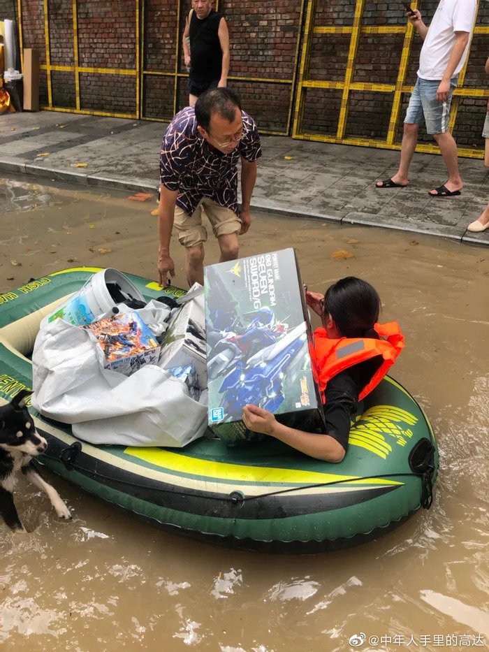 “Secondo quanto riportato dai primi avvisi, il livello dell’acqua non avrebbe dovuto raggiungere il secondo piano, ma nei fatti è continuato a salire. [L’uomo] non sa nuotare. Sua moglie ha attraversato a nuoto il fiume Yangtze e, una volta stabilito che il rischio presentato dall’acqua non fosse così alto e indossando un gilet salvagente, ha deciso di portare in salvo i Gundam.”