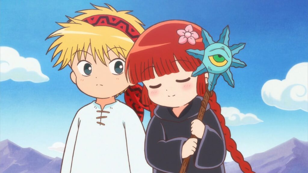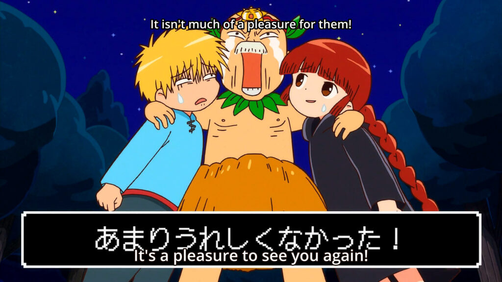 Abbiamo allora Nike che dovrebbe essere l’impavido guerriero, ma in realtà è perlopiù un ragazzino particolarmente astuto che fa di tutto per evitare di combattere, mettendo in prima linea Kukuri che invece cerca di fare del suo meglio come strega ed erede dell’arte magica Guru Guru. Sul loro cammino compaiono poi altri personaggi, uno più stravagante e nonsense dell’altro, a smorzare gli aspetti in qualche modo statici e ripetitivi della struttura del JRPG. D’altronde la comicità demenziale è ciò che ha reso famoso l’anime di Guru Guru e questa si origina soprattutto dai personaggi secondari: Reid, il principe delle tenebre impaurito dai mostri e che usa incantesimi di magia nera ridicoli; Gail, anche lui presentatosi al cospetto del re sperando di essere il Valoroso Guerriero designato; e come dimenticare il vecchio Edvarg, che balla la sua danza Kita Kita, capace di irritare non poco i mostri e di provocare imbarazzo e disgusto nei protagonisti, ma risate agli spettatori, così come le numerose comparsate e battute di tutti i vari comprimari, ognuno dei quali ha un modo di fare che lo rende memorabile.