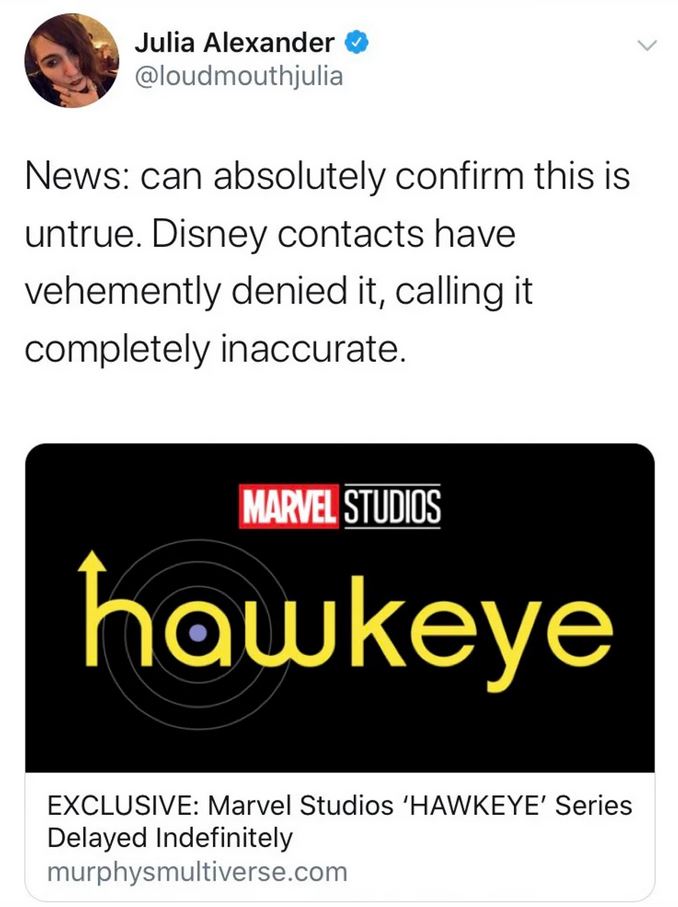 “Posso confermare che non è assolutamente vero. I [nostri] contatti alla Disney hanno fermamente negato [il rinvio di Hawkeye] definendo [il report] completamente inaccurato”