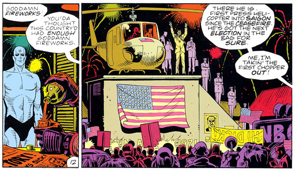 Ma l’idillio dura poco. La possibilità di poter contare su un uomo (Super-uomo? Extra-uomo? Oltre-uomo?) capace di annientare i missili sovietici in volo ha dato un enorme vantaggio agli USA, che hanno vinto la Guerra del Vietnam e Nixon è stato rieletto per ben 5 mandati consecutivi. Ancora una volta, tutti questi avvenimenti sono probabili e conseguenziali. Inoltre, l’esistenza di Manhattan ha creato un forte senso d’inferiorità nei confronti degli eroi mascherati da parte della gente comune, che si è sentita messa da parte, minimizzata, superata. E le sommosse popolari hanno costretto il governo ad applicare una legge, il cosiddetto Decreto Keene del 1977, che ha messo al bando i vigilanti. Alcuni si sono ritirati, altri si sono dati alla clandestinità e altri ancora hanno deciso di collaborare col governo. Ed è proprio quando uno di loro, il “Comico” Edward Blake, viene brutalmente assassinato che comincia la storia di Watchmen.